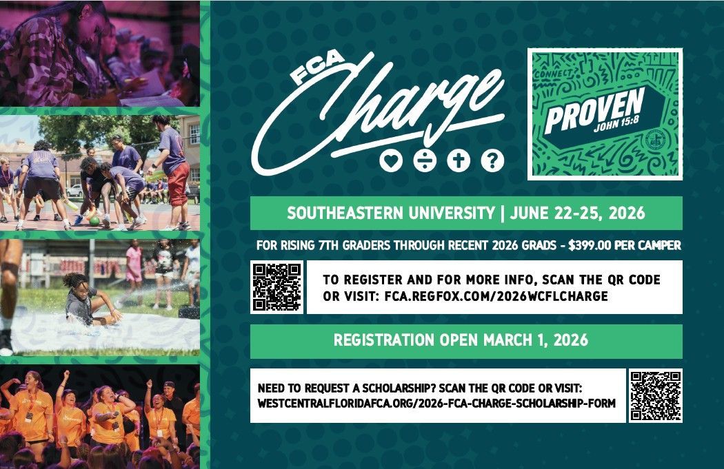 FCA Charge Camp is designed to engage 7th graders to 2026 high school graduates who are new in their faith and/or want to learn more about following Christ.